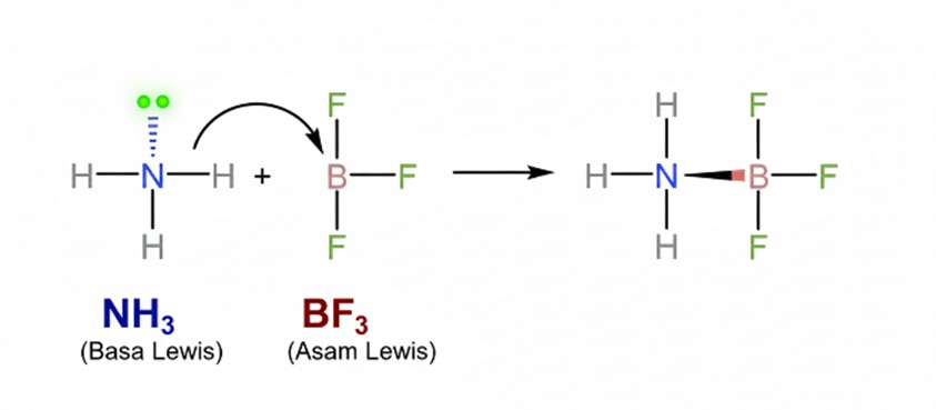 NH3 berperan sebagai basa lewis karena pada gugus N masih memiliki pasangan electron yang dapat diberikan kepada BF3 yang berperan sebagai asam lewis yang menerima pasangan elektron.